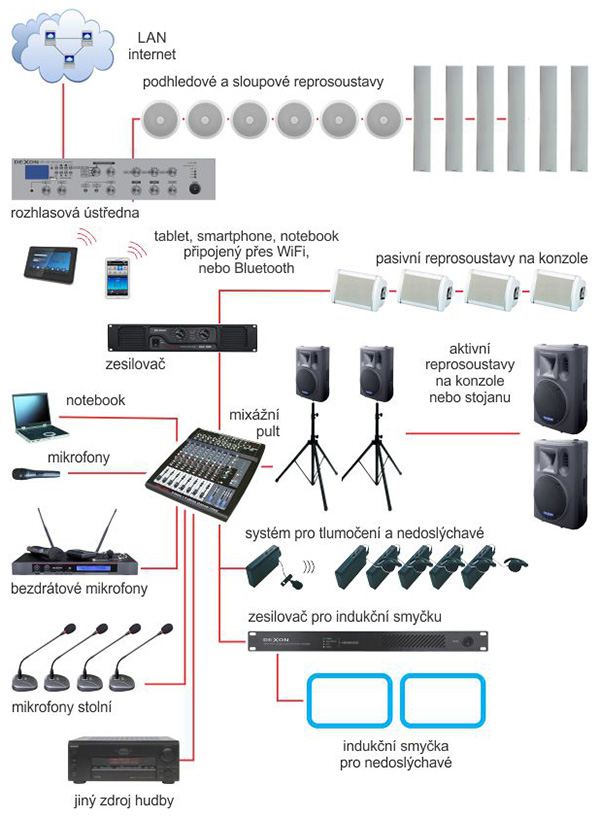 Jako zdroje signálu se dnes mohou používat nejenom dataprojektory, televizory, monitory, notebooky, ale také např. i tablety, smartphony, nebo starší DVD přehrávače. S ohledem na tuto skutečnost je potřeba zvolit vhodný mixážní pult, u kterého nepotřebujeme ani tak velký komfort obsluhy, jako spíše dostatek stereofonních vstupů, k čemuž se výborně hodí např. DMC 2220 nebo DMC 2440. Na tyto mixážní pulty ještě nezapomeneme napojit bezdrátový mikrofonní komplet MBD 940 (ruční) nebo MBD 940 (náhlavní + klopový), nebo jejich vícekanálové ekvivalenty, vše podle toho, kolik „mobilních“ řečníků předpokládáme. Samozřejmě se hodí i mikrofony „drátové“ z řady MD, to když řečníci sedí (zasedání úřadů, představenstev), nebo pultíkové PA 580