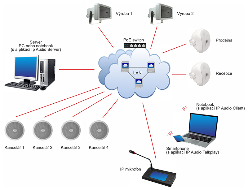 - Jenom do vaší počítačové sítě (nebo kdekoli na světě) připojíte IP zařízení (zesilovače, reproduktory, ústředny, mikrofony, interkomy, atp.) Bez námahy, bez složitého napájení a kabeláže. Pak nainstalujete software do centrálního počítače – serveru a obslužné aplikace. A je hotovo.